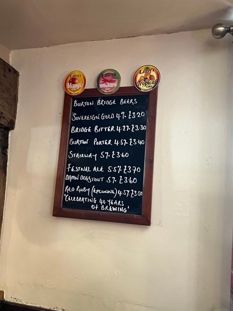 Quick walk again up to Burton Bridge Inn, home of Burton Bridge Brewery. A lovely 17th Century pub which fronts the brewery, renovated in 2000. The Brewery and Burton Bridge Inn opened in 1982. This exceptional small bar is really old fashioned snd traditional.