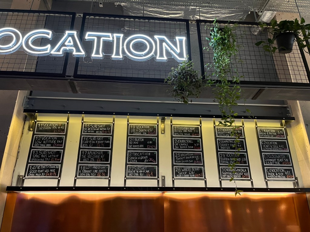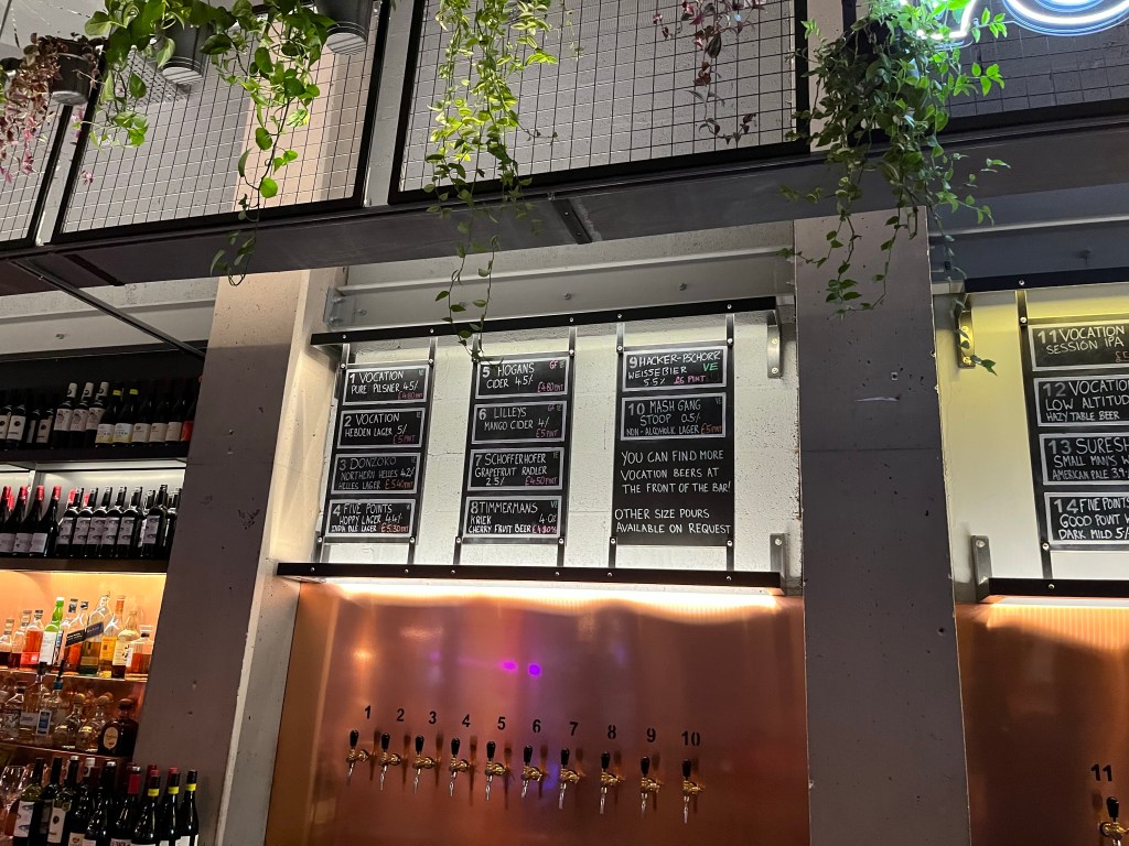 Situated next to Bridgwater Hall is Vocation Breweys Bar “Society”. Similar to Assembly Underground in Leeds with shared seating and lots of food stalls around with a main bar.
