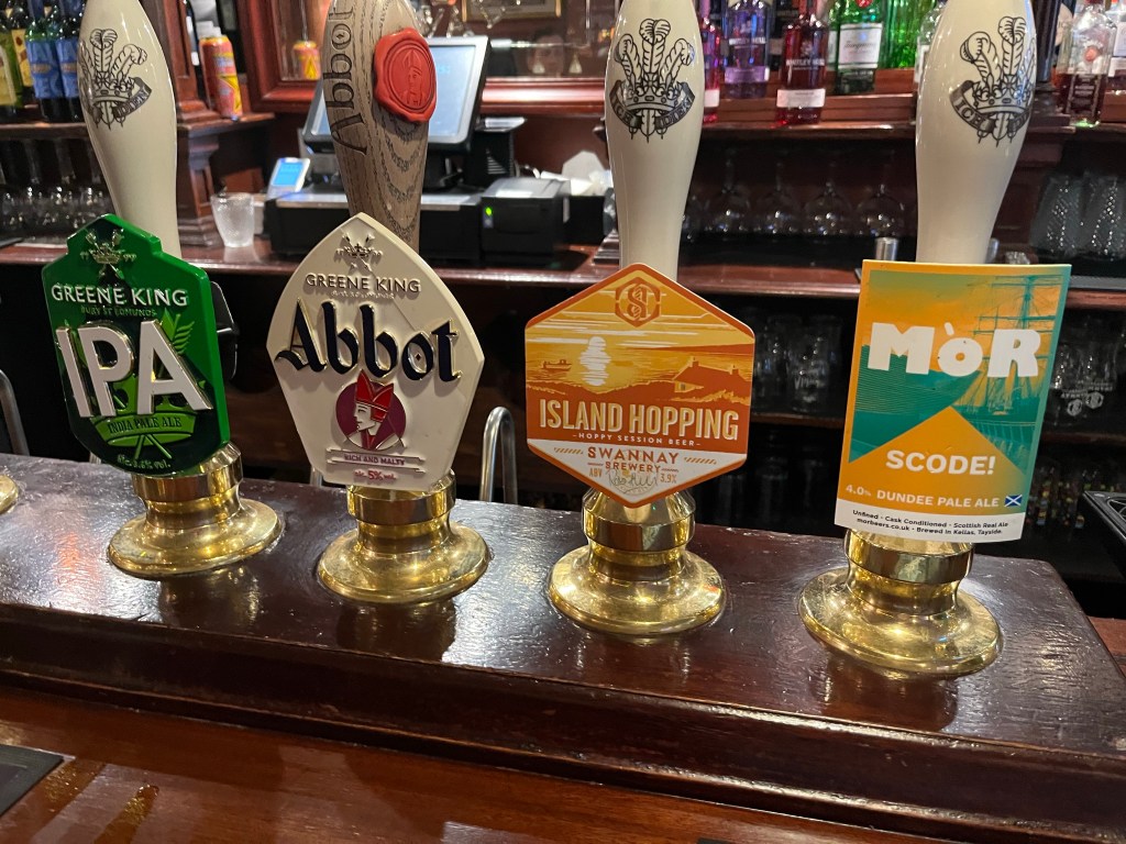 4 Cask Ales to choose from here. 2 of the usual (Greene King IPA and Abbot Ale), the other 2 being Swannay Brewery – Island Hopping and Mor – Scode! (From a small Micro Brewery in Dundee), went for the latter and was impressed with how much flavour the beer had.