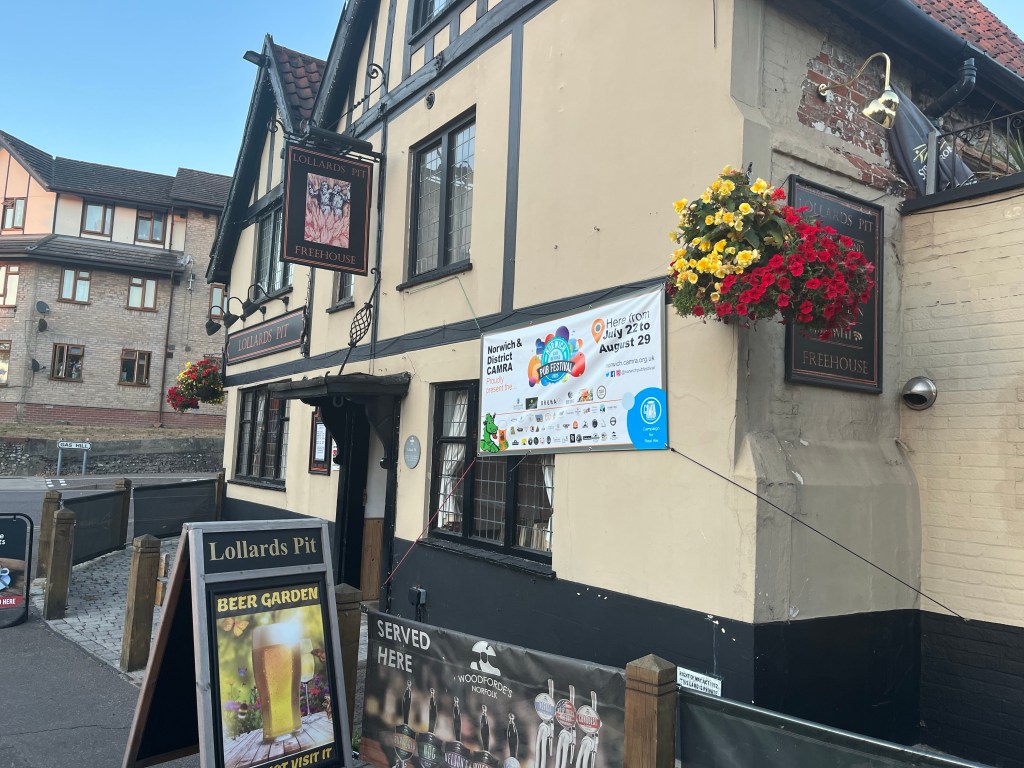 Back into Norwich centre now to try a couple of pubs near Norwich Riverside. First was “Lollards Pit”. This is a large 17th Century building which was one of the first pubs to be built outside of the city walls. It is on the site of Lollard’s Pit – a place of execution for heretics hence its name.