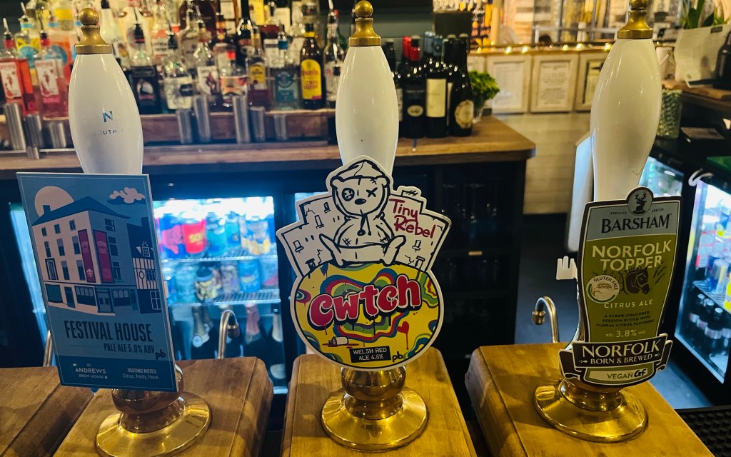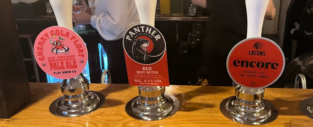 A choice of 6 ales on the bar, mainly from local breweries. Went with a pint of “Red” from Panther Brewery in Reepham, Norfolk.