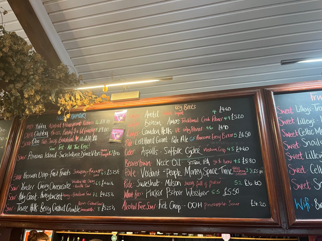 A good selection of cask ales on here to choose from, a lot being local breweries. The “Hibiscus Blonde” stood out, a sweet blonde ale infused with hibiscus petals giving it a tart berry flavour. The brewery is based in Bury St Edmunds.