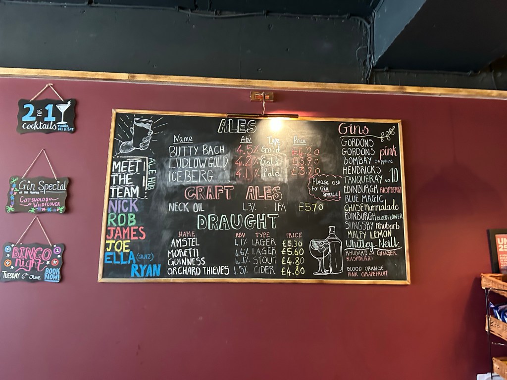 A great choice of 7 cask beers here alongside a couple of keg beers and a selection of ciders. I went with “Summer House” from New Buildings Brewery in Leicester, a new brewery for me. A tasty IPA with a bit of strength.