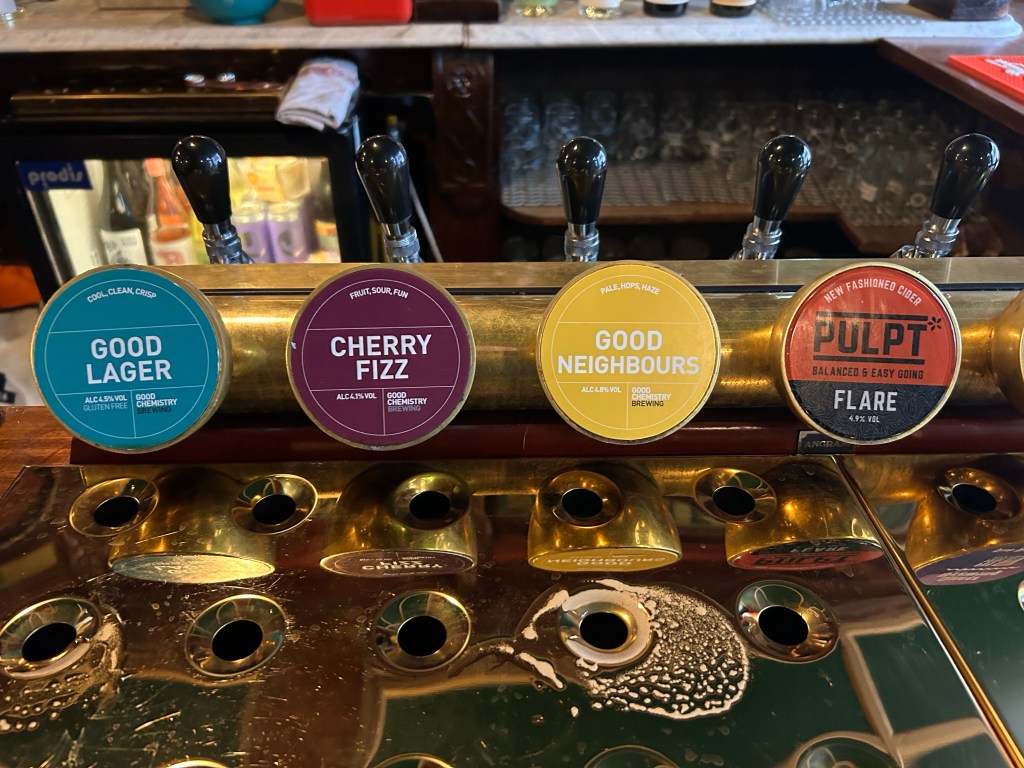 A choice of 3 cask beers (one from Good Chemistry and 2 Guests), alongside a choice of 7 keg beers. I went with “Cherry Fizz”, a fruity sour beer packed full of cherry flavour.